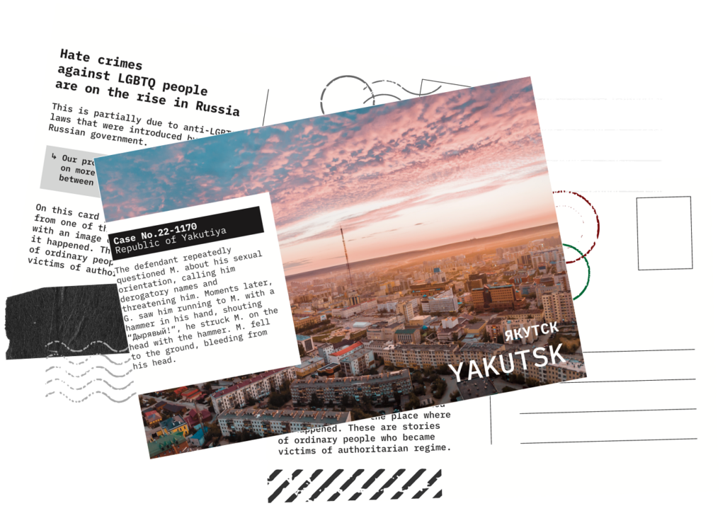 Pushkin House Bookshop in London hosts the art project “Places of Interest”, a series of postcards describing hate crimes on the background of Russian cities, where these crimes took place. Get a copy of one of these postcards by supporting our project.